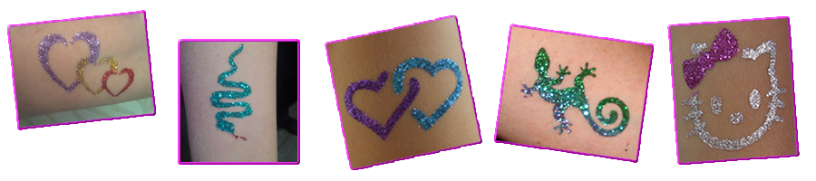 Why not add some sparkle to your next event with glitter tattoos! Guests of any age whether young or just young at heart will love this trendy & exciting form of body-art. Popular with children, teens & adults at parties, weddings and proms. Even celebrities are following this new craze as glitter tattoos are often used to complete a look for a red carpet event. Our glitter tattoos last from 3-7 days depending on skin type and maintenance and are hypo-allergenic. If required, they can easily be removed using baby oil or any oil based lotion. With a large variety of designs and colours there is something to suit every imagination. Or for something less permenant why not try a painted arm design for a more temporary tattoo effect |